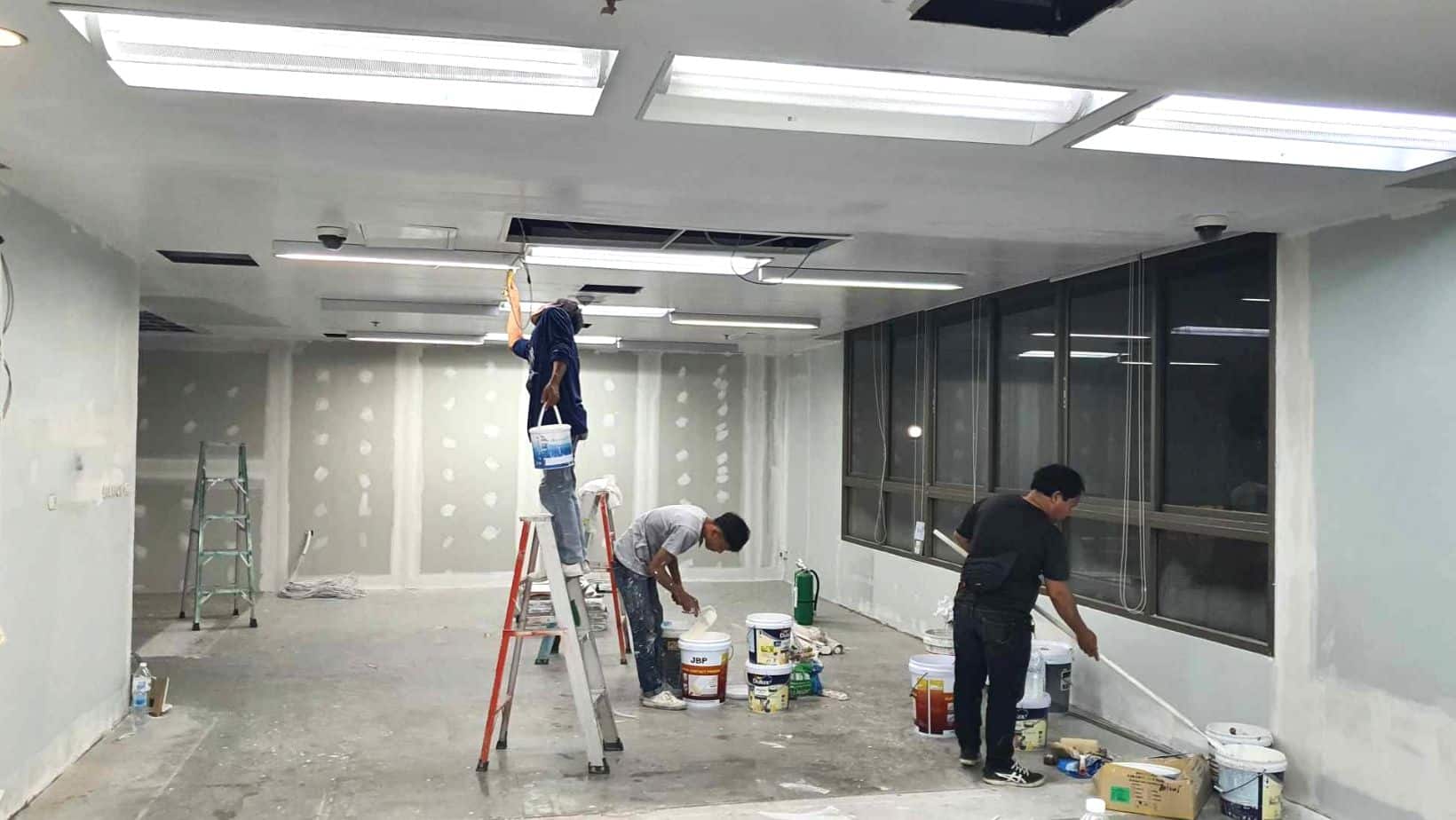 สเตปหลุมกลม สเต็ปเลื่อย ฝ้าทีบาร์ ฝ้าแขวน ผนังเบากั้นห้อง และทาสีโรยตัวอาคารตึกสูง